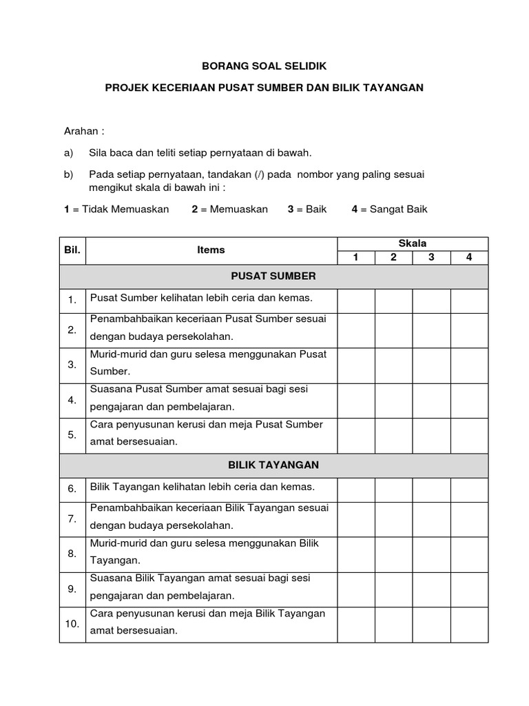 Penggunaan medium seperti borang soal selidik kaji selidik dan medium lain untuk mengumpul data numerik atau data yang boleh diukur 63 Admin contoh soalan soal selidik pengangkutan awam selangor p pdf kajian penerokaan buli siber dalam kalangan pelajar umt. JABATAN PELANCONGAN DAN HOSPITALITI DTM6024TOURISM PROJECT SOAL SELIDIK BERKENAAN DENGAN APLIKASI MUDAH ALIH BUKU PANDUAN PIS-PISCLICK Kajian ini dilaksanakan. 2 mewakili tidak setuju.